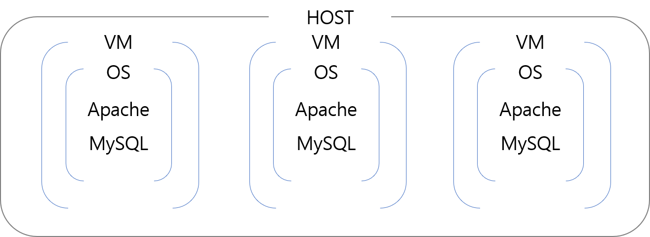 누군가가 웹 서버를 운영하는데 필요한 소프트웨어를 전부 설치한 컴퓨터를 제공해준다면, 단지 개발만 하면 되기 때문에 매우 행복할 것이다. 이를 가능케 하는 방법으로는 대표적으로 가상머신(VM)이 있다. 가상머신에 운영체제와 웹 서비스를 운영하기 위한 소프트웨어를 설치해놓고 이를 이미지 파일로 남겨놓는다고 가정해보자. 그러면 새로운 웹 서비스를 개발할 때마다 해당 이미지를 복사해서 가상머신을 실행시키기만 하면 되기 때문에 위에서 언급한 복잡한 과정을 거치지 않아도 된다. 그러나, 가상머신에는 한 가지 단점이 있는데, 그건 바로 용량이 무겁다는 것이다. 먼저, 가상머신에 설치되는 운영체제는 결코 가볍지 않으며, VMware나 VirtualBox와 같이 가상머신을 구동시키는 소프트웨어는 현재 자신의 PC와 같은 또 다른 운영체제에서 실행되어야 하기 때문이다.
