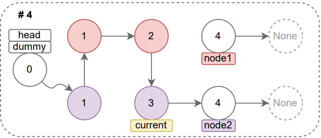 node1에 위치한 노드의 값이 더 작으므로 current의 다음 포인터(current.next)를 node1의 위치로 변경하고, node1의 포인터는 자식 노드(node1.next)를 가리키도록 변경한다(이어서 node1과 node2의 값 비교 -> 결과 4번 그림).
