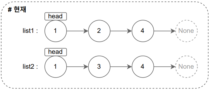 문제에서 주어진 예시(list1 = [1, 2, 4], list2 = [1, 3, 4])를 그림으로 나타내면 다음과 같다. 이 둘은 노드의 값을 기준으로 오름차순으로 정렬되어 있으며, 가장 왼쪽에 있는 노드가 각 연결 리스트의 head라고 할 수 있다.