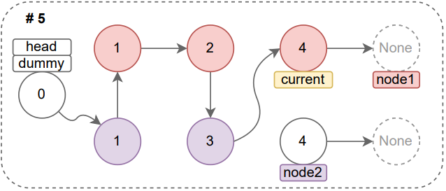 node2에 위치한 노드의 값이 더 작으므로 current의 다음 포인터(current.next)를 node2의 위치로 변경하고, node2의 포인터는 자식 노드(node2.next)를 가리키도록 변경한다(이어서 node1과 node2의 값 비교 -> 결과 5번 그림).
