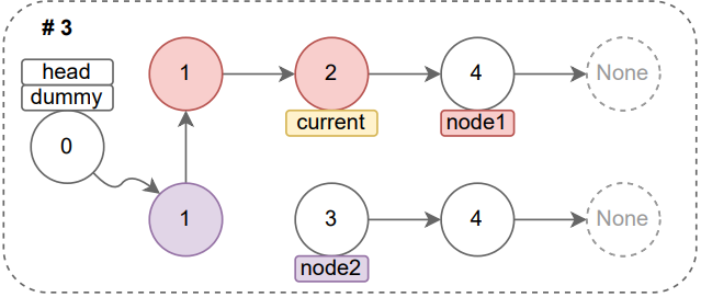 node1에 위치한 노드의 값이 더 작으므로 current의 다음 포인터(current.next)를 node1의 위치로 변경하고, node1의 포인터는 자식 노드(node1.next)를 가리키도록 변경한다(이어서 node1과 node2의 값 비교 -> 결과 3번 그림).