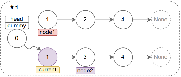 그렇다면, 임시 노드를 생성하여 head로 정해놓고, 주어진 연결 리스트 2개의 노드 값을 비교한 결과에 따라 임시 노드 뒤에 연결시키면 되지 않을까라는 생각으로 문제에 접근하였다. 이를 그림과 설명으로 나타내보면 다음과 같다.