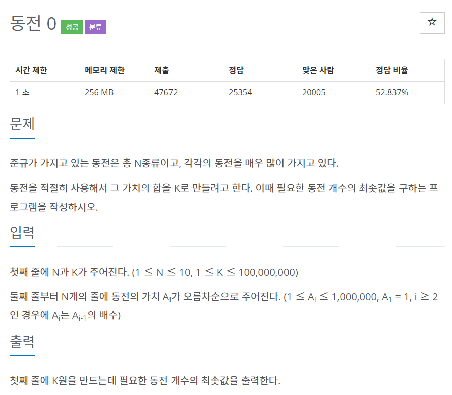 N)과 가치의 합(K)를 입력받는다. - 동전의 가치가 담긴 정보(