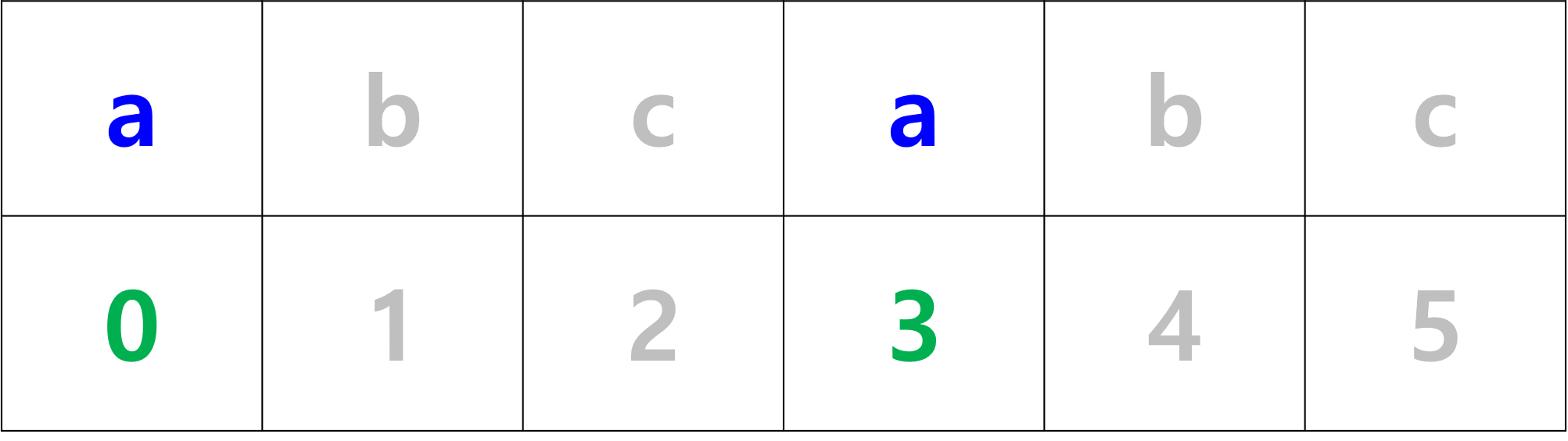 또, 두 번째 예제 중 abcabc에서 a의 수량(=길이)은 2, a의 시작과 끝 인덱스는 아래 그림과 같이 0과 3이다. 그리고 공식을 적용시켜본 결과 2 = 3 - 0 + 1로 공식이 성립하지 않으므로, 불연속적인 상태라는 것을 알 수 있다.