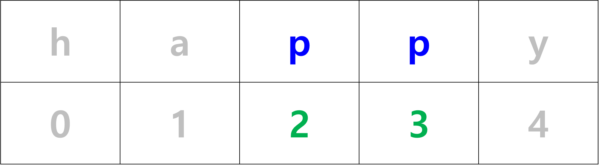 첫 번째 예제 중 happy에서 p의 수량(=길이)는 2, p의 시작과 끝 인덱스는 아래 그림과 같이 2와 3이다. 그리고 공식을 적용시켜보면 2 = 3 - 2 + 1로 공식이 성립하므로, 연속적인 상태인 것을 알 수 있다.