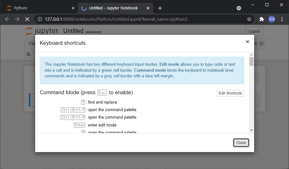 새로운 셀을 생성하거나, 코드를 실행할 때 단축키를 활용하면 더욱 효율적으로 작업을 할 수 있다. 단축키 정보는 Help 메뉴 중에서 Keyboard shortcuts를 클릭하거나, esc 키를 누른 후 H 키를 눌러 확인할 수 있다.