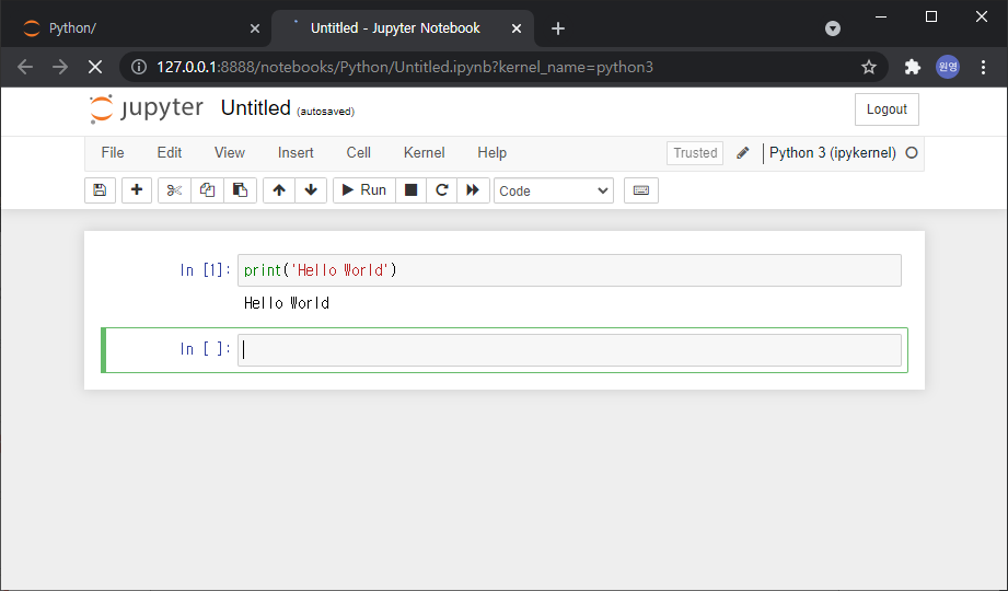 Run 버튼을 클릭하여 코드를 실행할 수 있다. 예를 들어, Hello World!를 출력하면 아래 그림과 같은 결과가 출력된다. 이때, 실행된 코드의 경우 In 옆에 번호가 부여되는데, 실행된 코드의 한 칸을 셀이라고 한다.