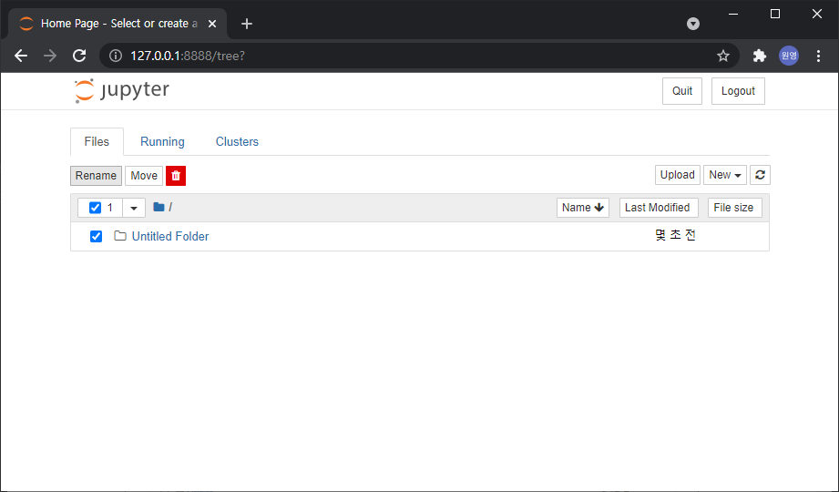 주피터 노트북 페이지에서 New 버튼을 클릭하고 Folder를 클릭하면 새로운 폴더를 생성할 수 있다.