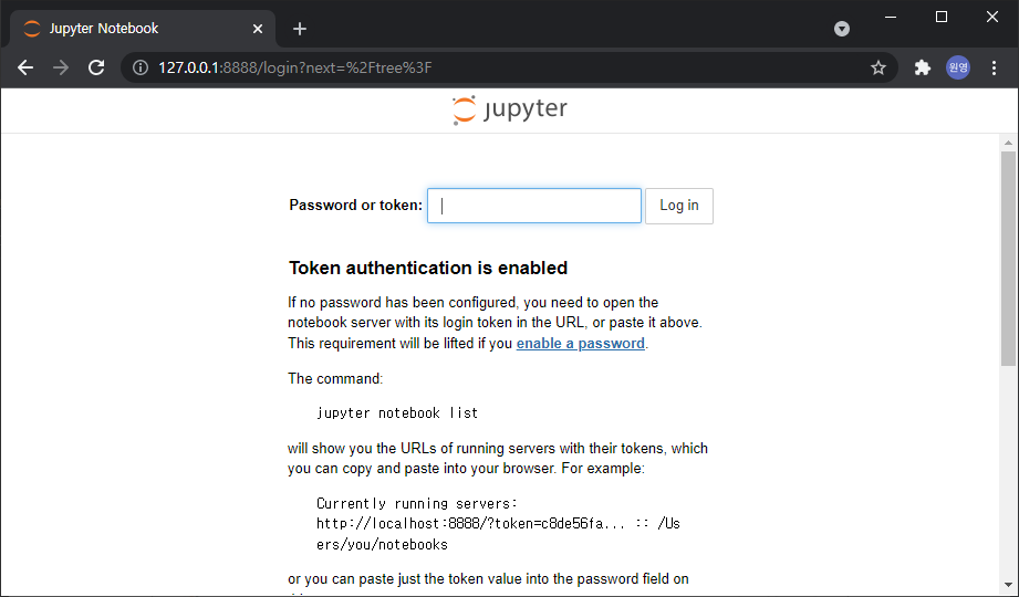 $ jupyter notebook웹 브라우저를 통해 로컬 서버로 접속하면 아래 그림과 같이 Password or token 입력 창이 나타나는데, 터미널에 출력된 로컬 서버 주소 뒤에 위치한 ?token= 뒤의 값을 입력 후 Log in 버튼을 클릭하면 주피터 노트북 Dashboard로 이동할 수 있다.