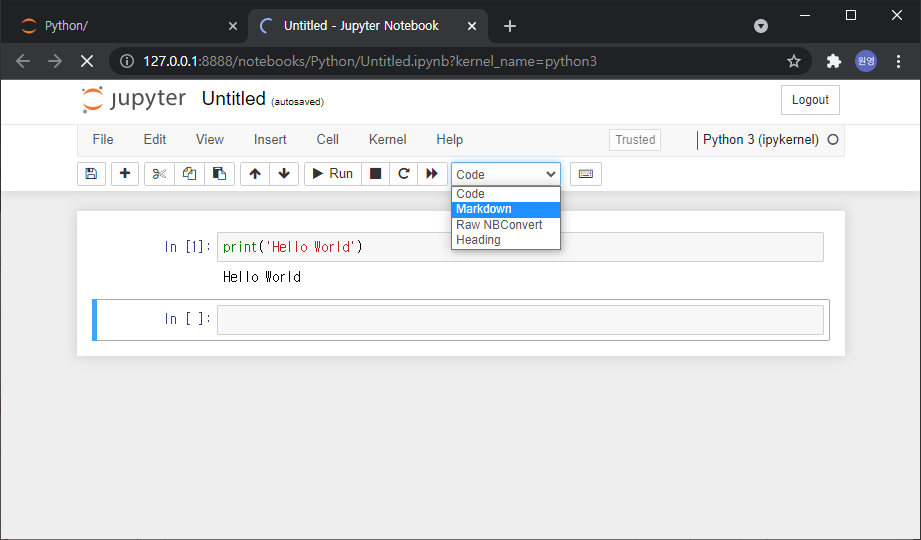 주피터 노트북은 마크다운(markdown)을 지원하며, 아래 그림과 같이 Code로 설정된 모드를 클릭한 후 Markdown으로 모드를 변경하면 마크다운을 입력할 수 있다. 마크다운 모드로 변경하면 셀 번호가 사라지고, 코드를 실행하면 마크다운 코드가 html로 인코딩된다.